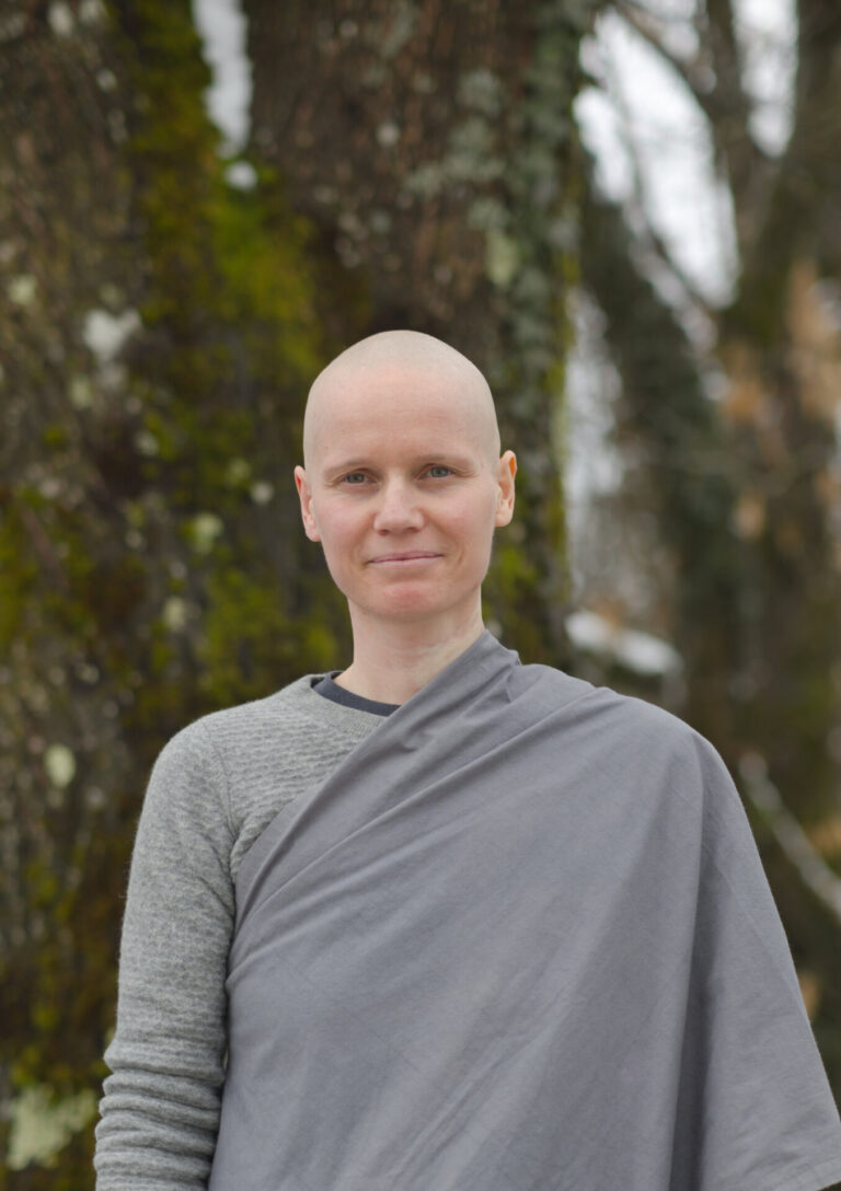 She was born in Stockholm, Sweden, in 1985. She took on anagārika precepts in July 2024 at Hillside Hermitage.